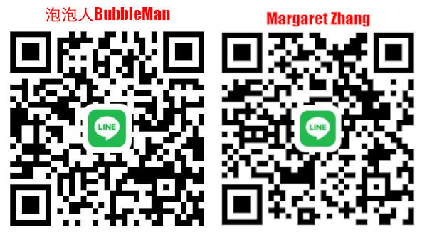 3. 如果你使用台湾、泰国、日本等地通用的Line,请开启Line软件,使用其上的扫描机制,对准张钧(泡泡人 BubbleMan)或陈泳(Margaret Zhang)的Line二维码,添加我们,就可与我们联络。
